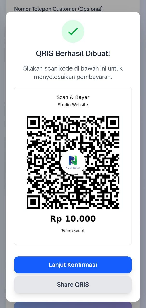 Aplikasi akan memproses QRIS statis Anda dan menampilkannya dengan nominal yang sudah terisi.